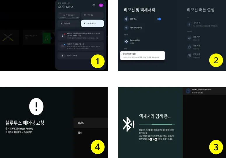 )버튼을 동시에 5초간 눌러줍니다. 페어링 모드의 메세지를 확인하면 블루투스 리모컨 연결이 자동 활성화됩니다.