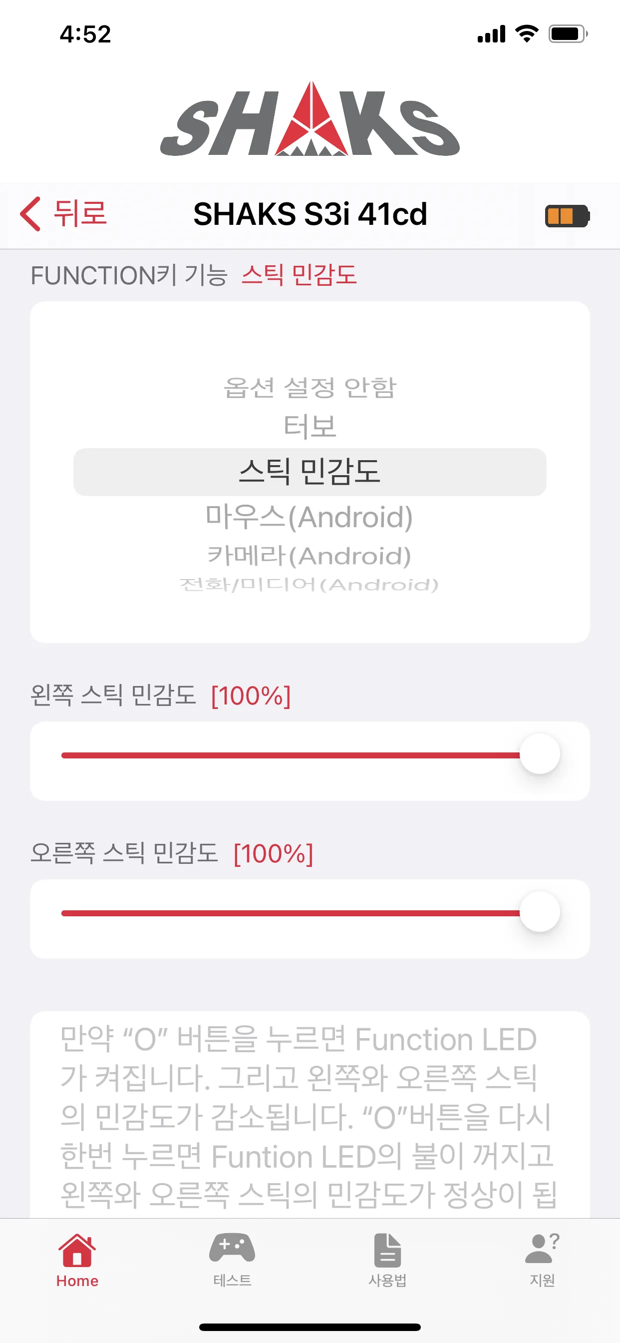 왼쪽/오른쪽 스틱을 보다 미세하게 움직이고 싶을 때 사용할 수 있습니다.  비례하여 %를 설정하시면 됩니다.