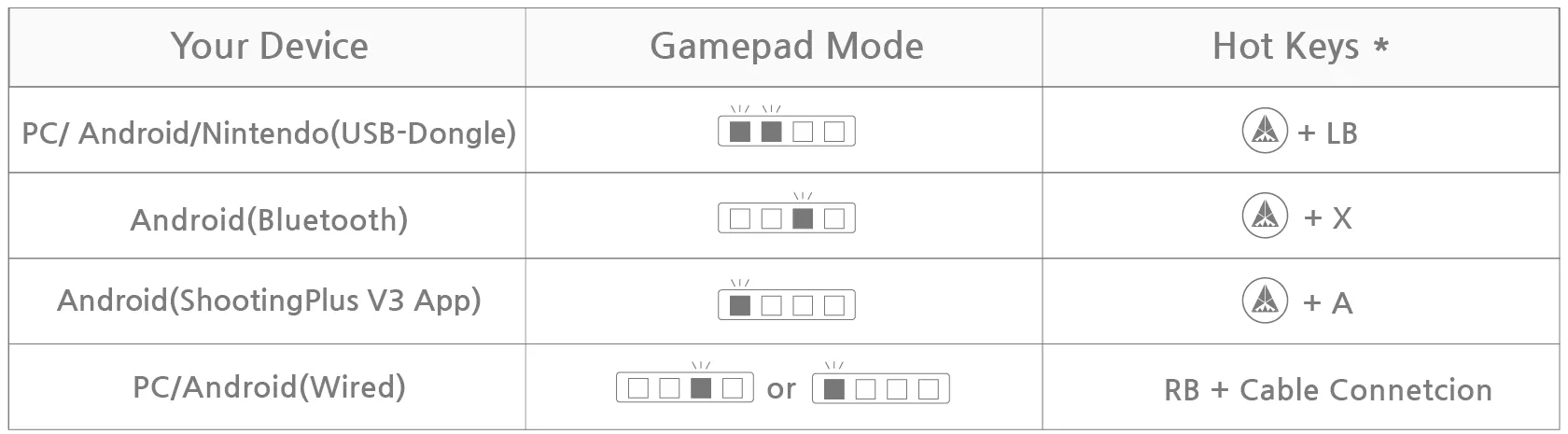 Mode change can be done by pressing the "Select+L1"  button or "hotkey".  Please the LED indication in the below table. The mode will change sequentially from Android→Windows, Mac→ iOS→ Android Mapping. Click to Video