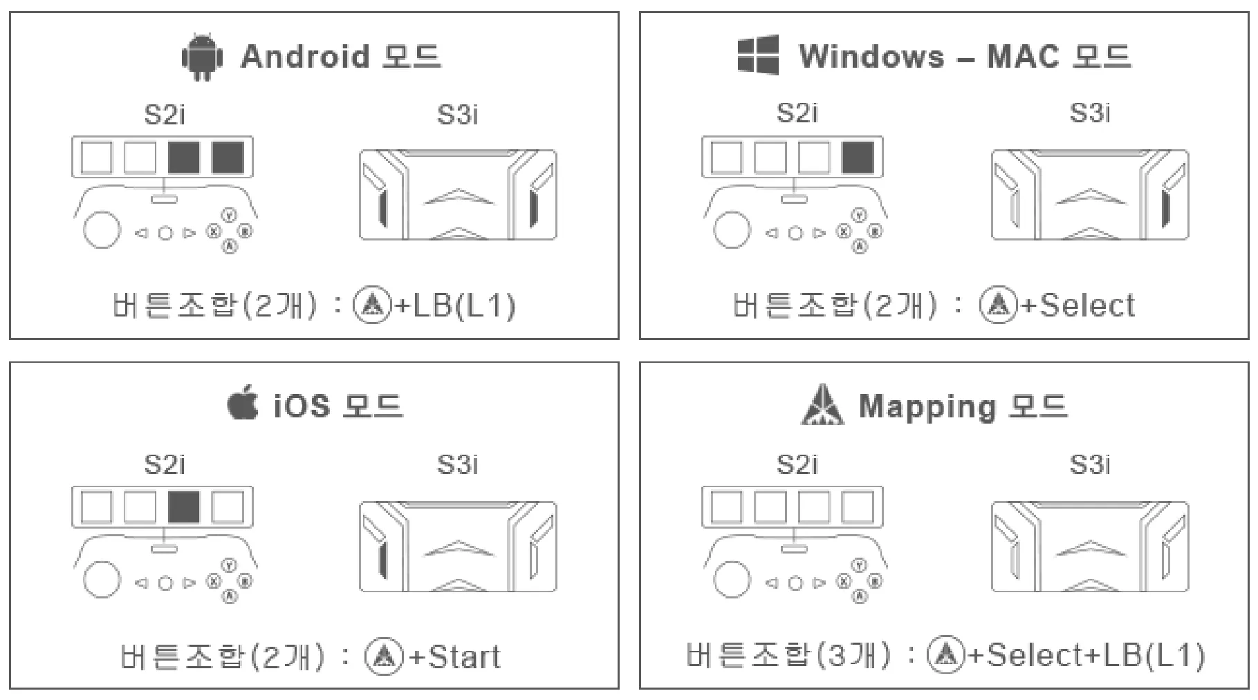 S1+ 게임패드의 모드는 아래의 키 조합으로 2초 정도 길게 누르시면 해당 모드로 변경됩니다.