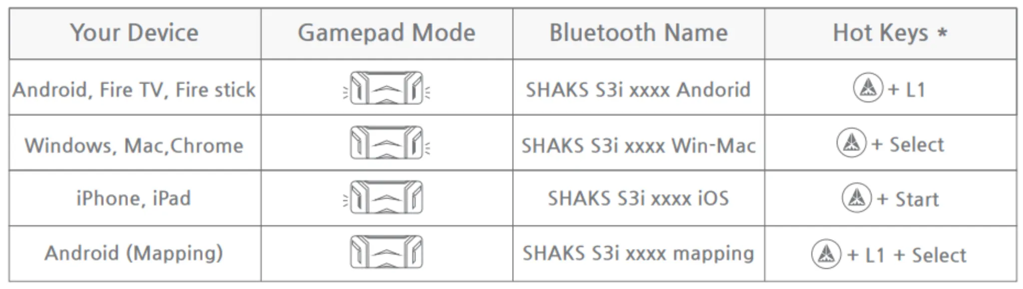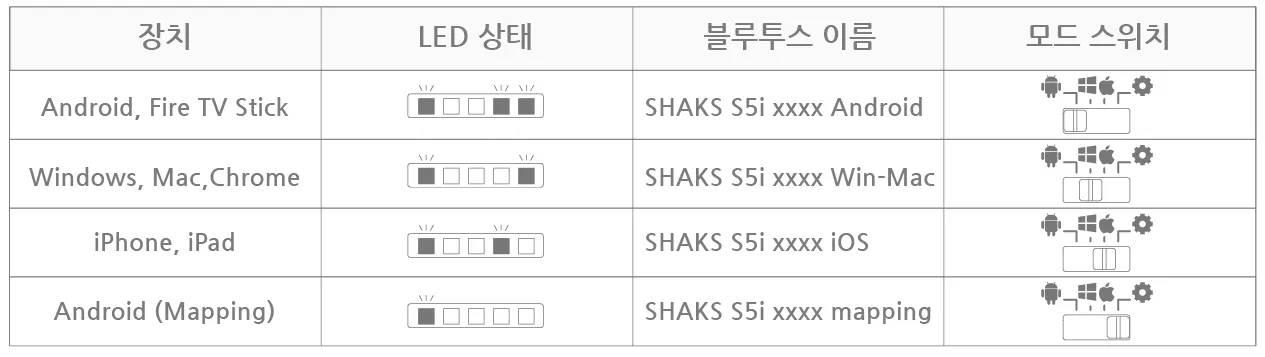 SHAKS 버튼 + A → 안드로이드 매핑용 모드 (ShootingPlus V3 매핑 앱 사용할 때)