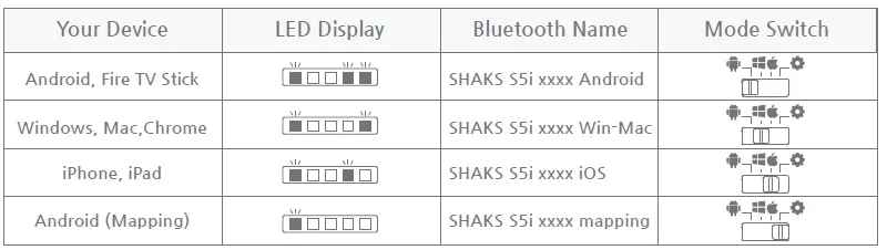 3 Step setup:  In power-off status,  change the mode and power it on. This setup is available from xxx 13 (Dec. 21, 2020) firmware. If you have an older version, please upgrade it via SHAKS Gamehub app. See below how to do 3 step setup.