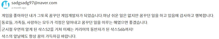 게임을 좋아하시다가 게임개발자도 되셨다는 sadgsadg97님, 꿈을 이루신거 축하드려요!