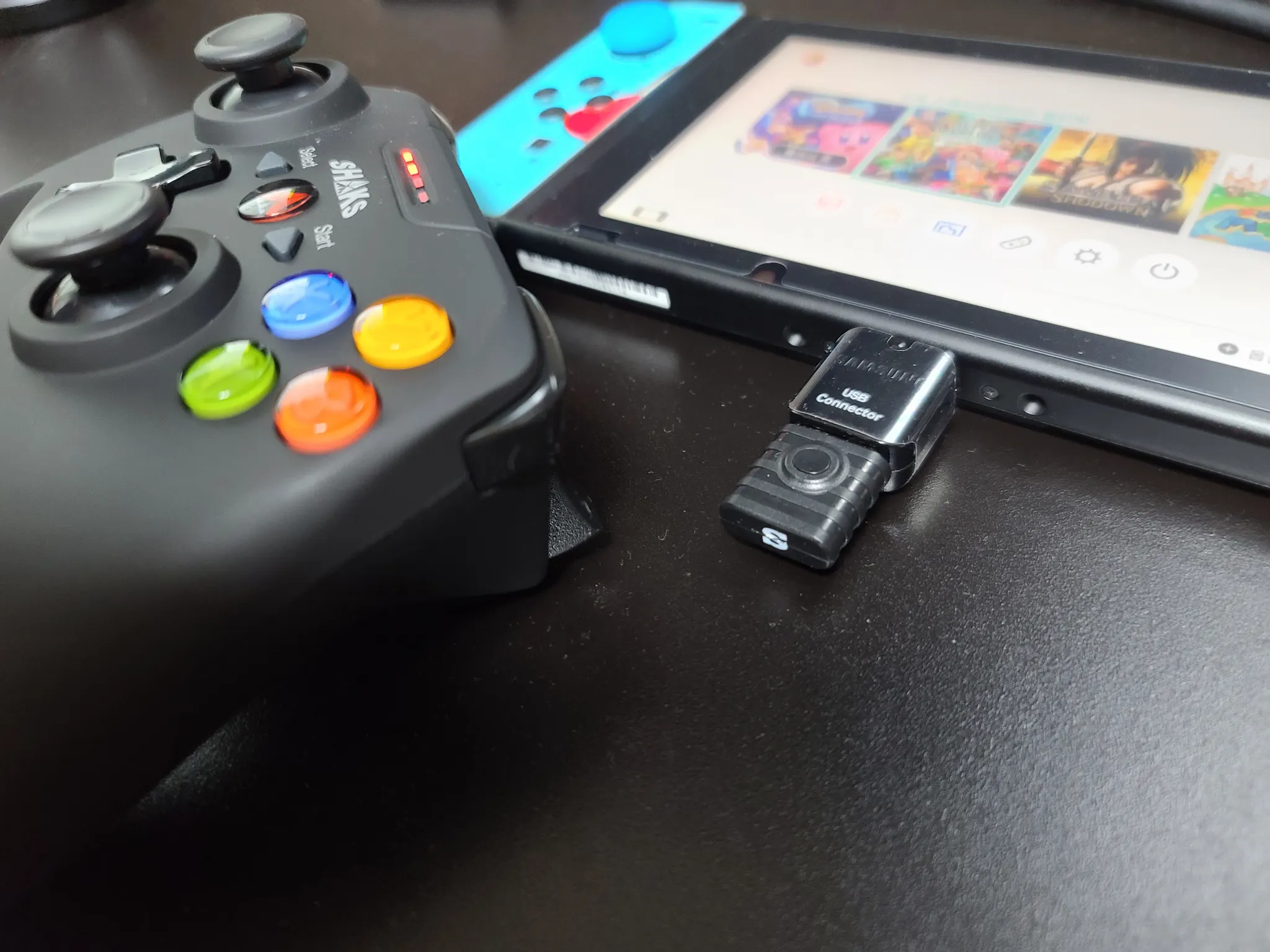 SHAKS S1+을 무선으로 연결할 경우, USB 동글을 닌텐도 스위치 본체에 꽂고, 게임패드에서 LB버튼과 전원 버튼을 3초간 누른다.
