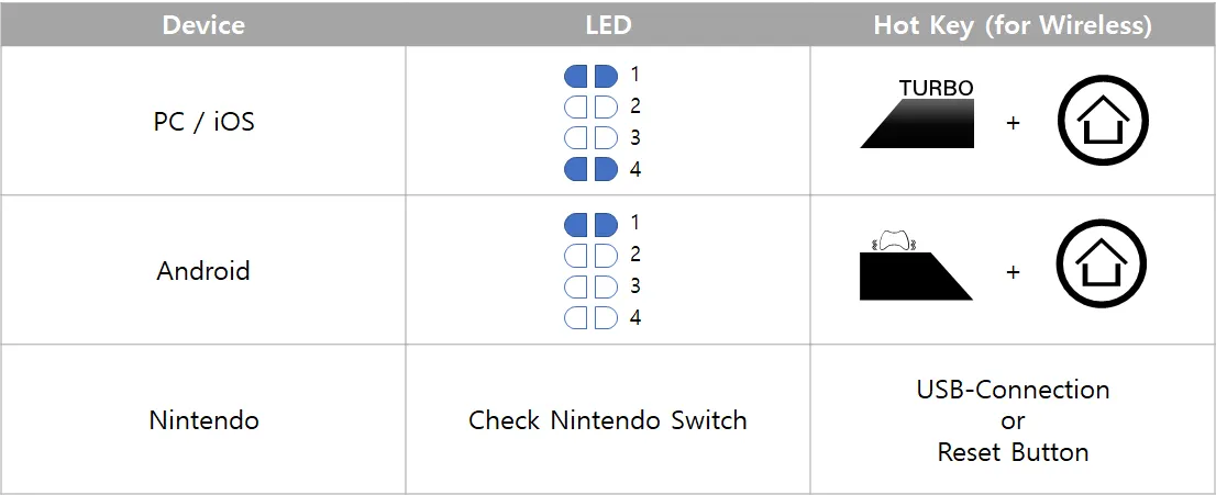Power on: Press 'Power Button' for 3 seconds. When the gamepad is turned on by pressing the 'Power button', the default is Android mode. Change mode according to the above table. And follow step 2 based on the device you wish to connect. After the initial setup is complete, the gamepad will remember your device to connect automatically.