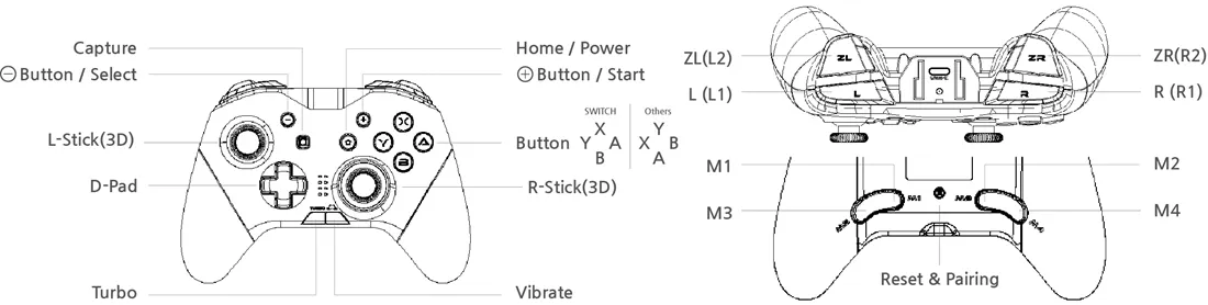 M1 - A 버튼, M2 - B 버튼, M3 - X 버튼, M4 - Y 버튼