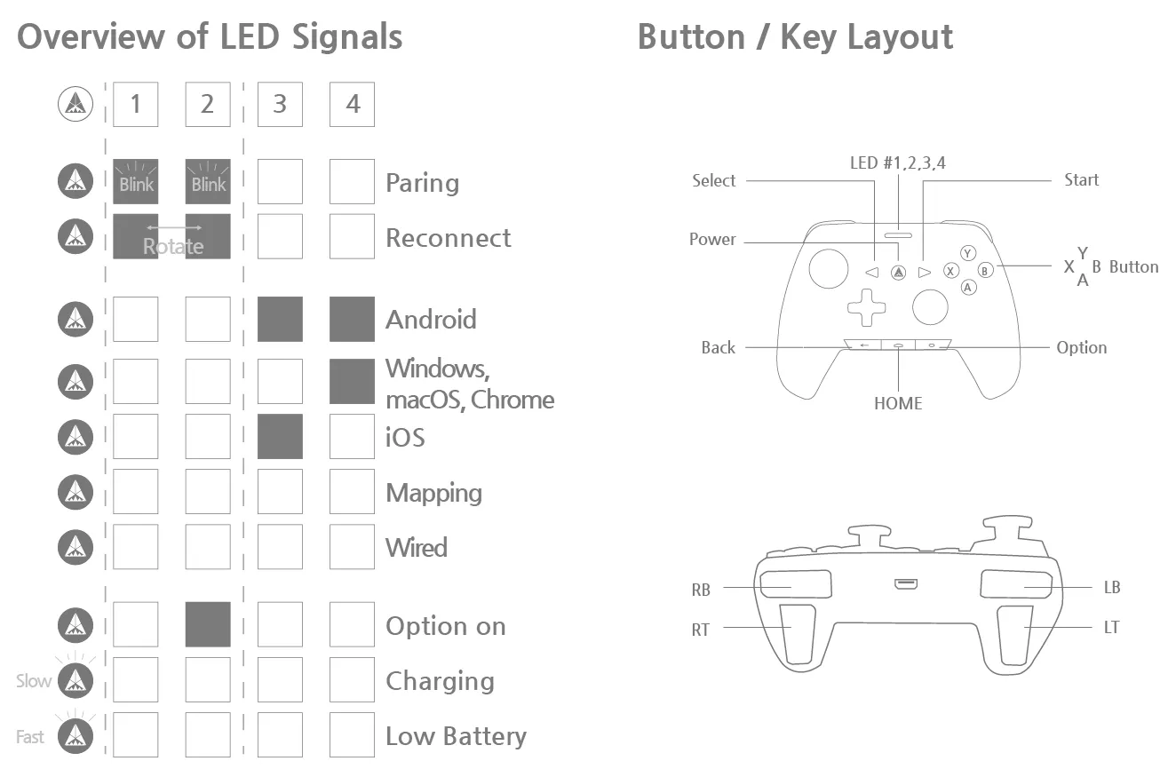 Comment utiliser le changement de mode de manière séquentielle : Appuyez simultanément sur les touches "Select+L1" jusqu'à ce que la LED s'allume. Ensuite, il s'éteint automatiquement. Remettez-le sous tension, appuyez à nouveau sur "Select+L1" pour démarrer. Et vérifiez le mode. Si vous n'êtes pas dans le bon modèle, répétez ce processus jusqu'à ce que vous voyiez la position correcte de la DEL correspondant au mode que vous voulez. Le mode changera séquentiellement d'Android→Windows, Mac→ iOS→ Android Mapping..