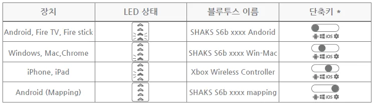 SHAKS S6b는 안드로이드, Windows, iOS 및 매핑으로 4가지 모드를 지원합니다. 예를 들어, 게임패드가 안드로이드 모드일때, 안드로이드 스마트폰이나 태블릿에 연결할 수 있고 안드로이드 게임패드처럼 작동합니다. 그러나 같은 블루투스로 윈도우로 연결을 할때에는 게임패드가 안드로이드 모드로 되어있기 때문에 작동하지 않습니다. 모드에 맞게 블루투스 연결을 해주셔야 연결이 됩니다.