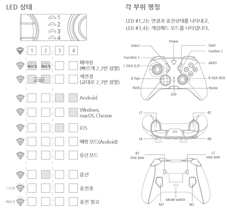 게임패드의 상태 확인을를 위해 버튼/키 이름과 LED표시를 확인하세요.
