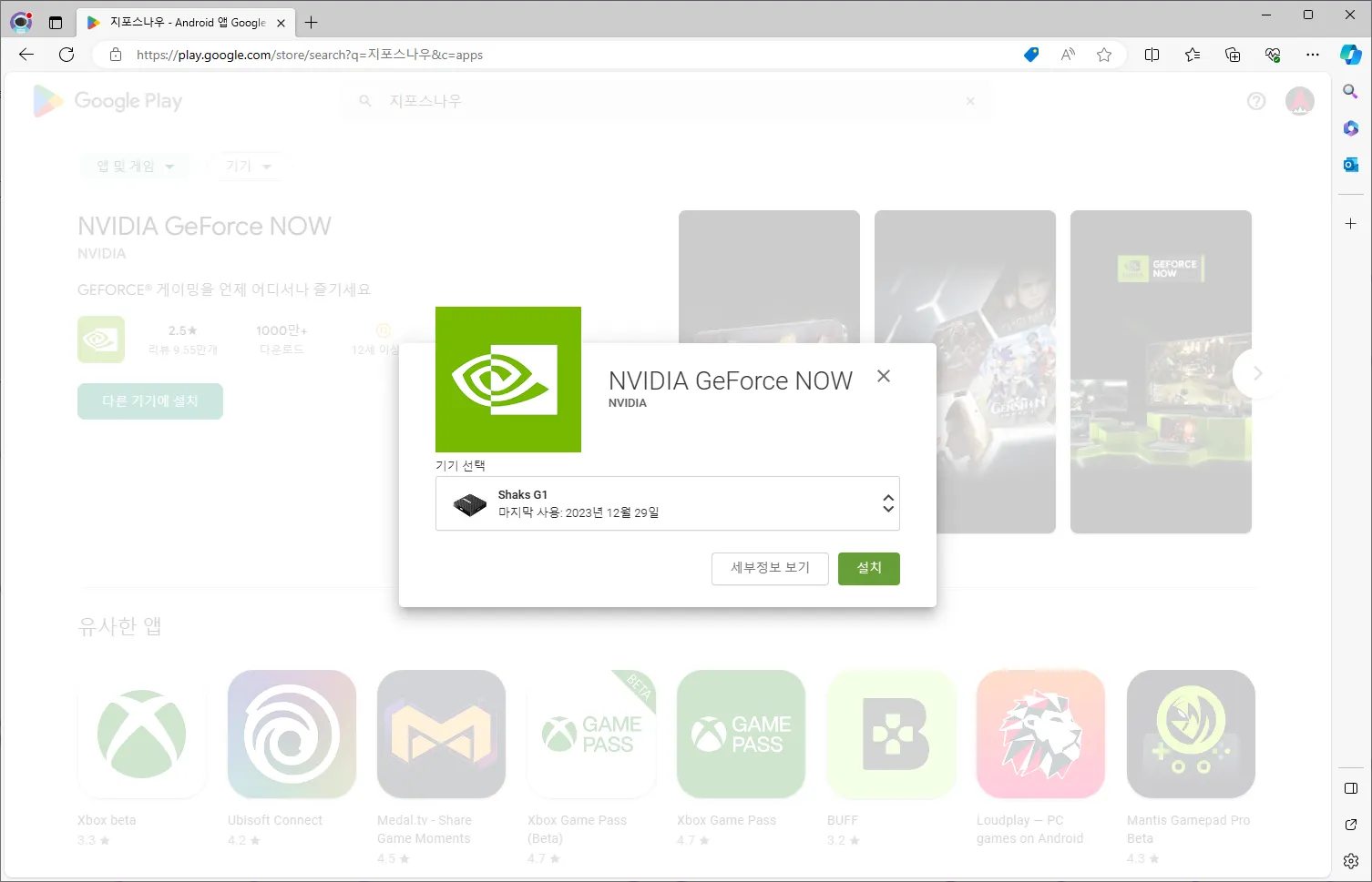 ‘다른 기기에 설치’ 버튼을 누른 뒤 기기 선택에서 ‘Shaks G1’ 을 선택하여 설치합니다.