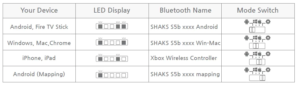 SHAKS S2i / S3i / S5i admite cuatro (4) modos, Android / Windows / iOS y Mapeo, cada uno de los cuales es reconocido individualmente por el dispositivo de juego anfitrión correspondiente. Por ejemplo, cuando SHAKS está en modo Android y se conectara a un smartphone / tableta Android, funcionará como un "Mando Android". Pero, si lo conectas a un PC con Windows, no funcionará correctamente, porque SHAKS avisará de "Estoy en modo Android", pero la PC no podrá escucharlo, aunque su conexión Bluetooth esté establecida...