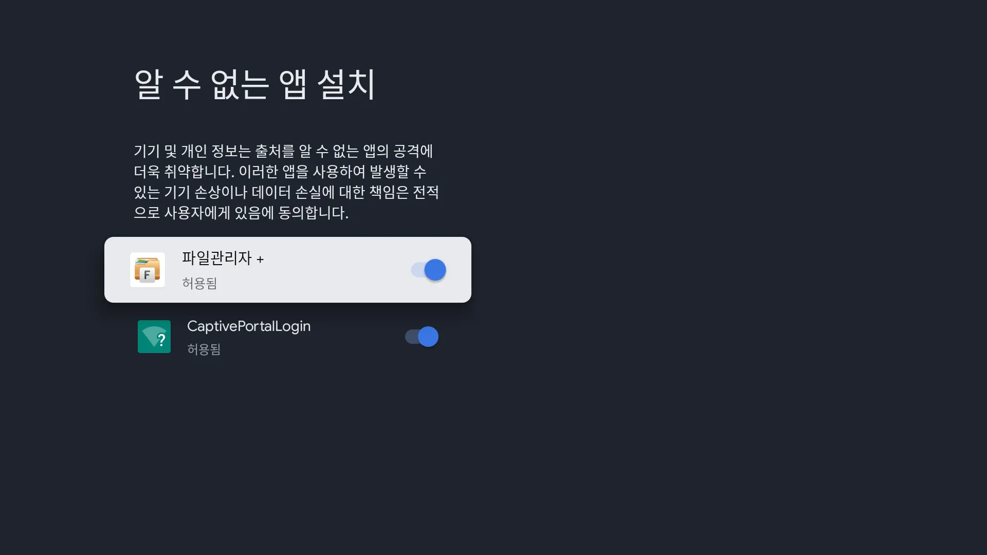 알 수 없는 앱 설치 화면에서 해당 앱에 대한 권한을 허용합니다.