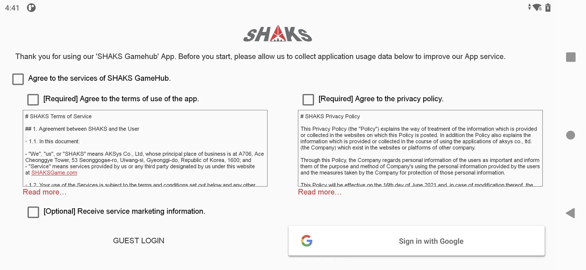 It is required to consent to the application service agreement and privacy policy.  SHAKS gives the most priority to protect the privacy of our clients.