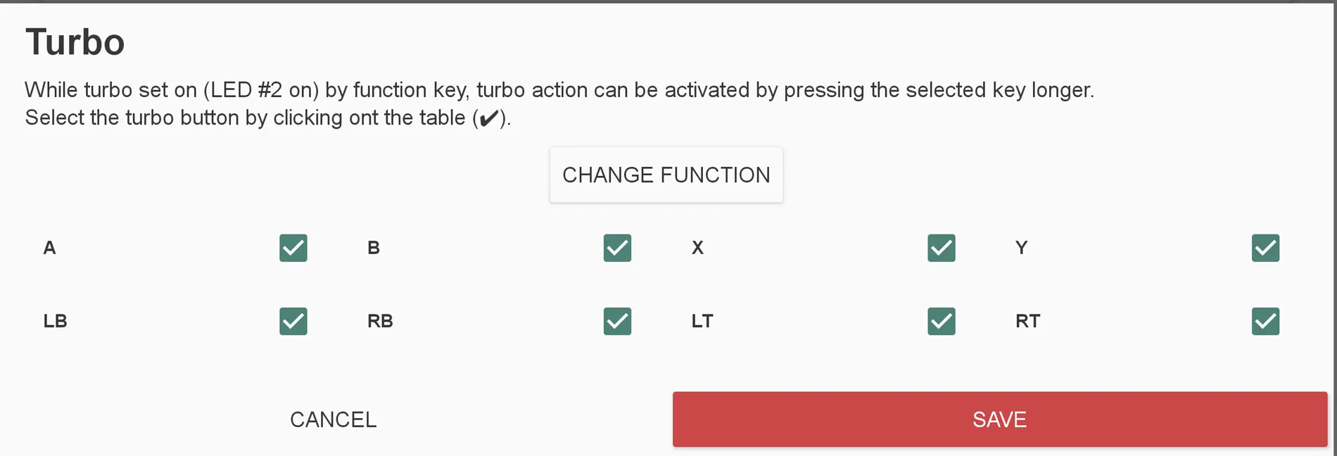Pressing the selected button longer. then turbo action is being activated.  You can select turbo button by clicking each box and then OK to store.