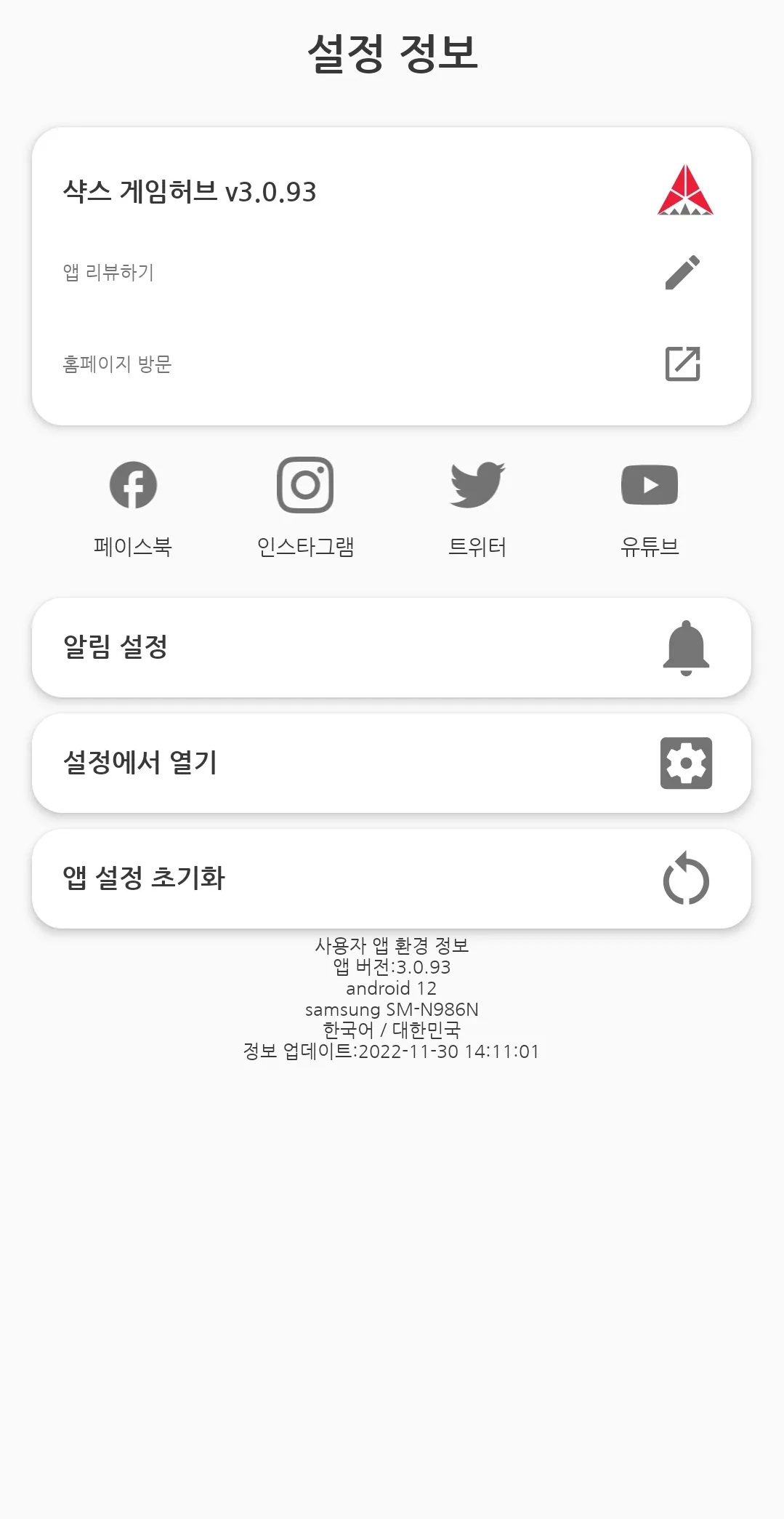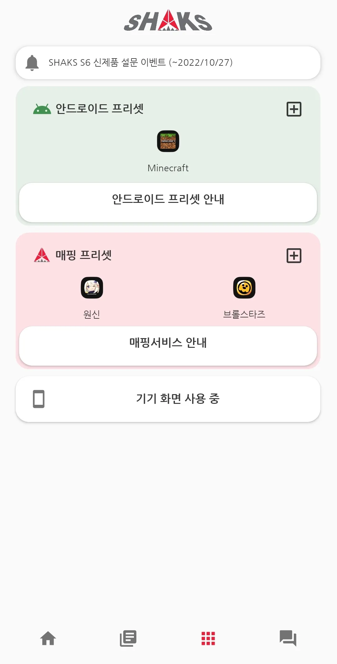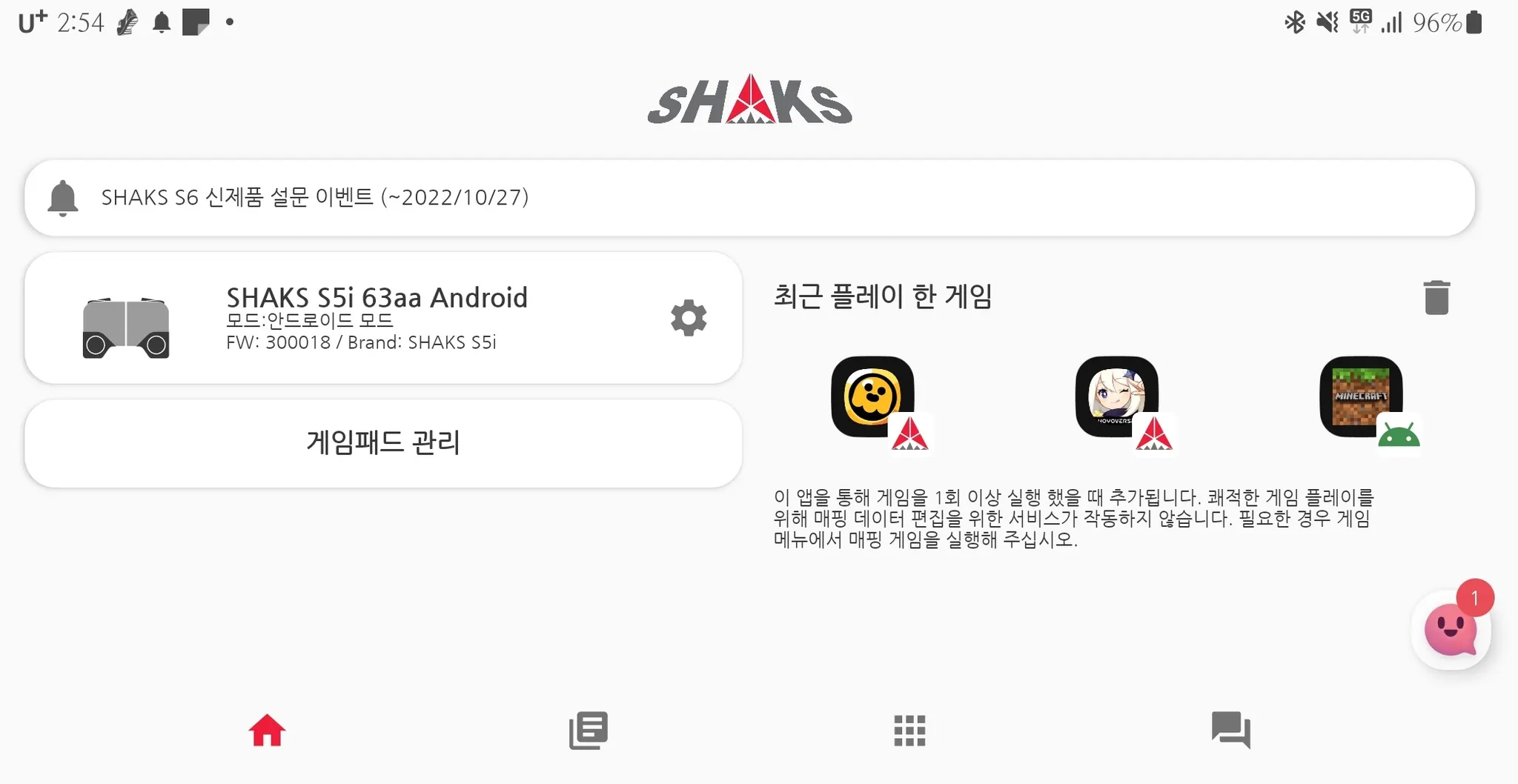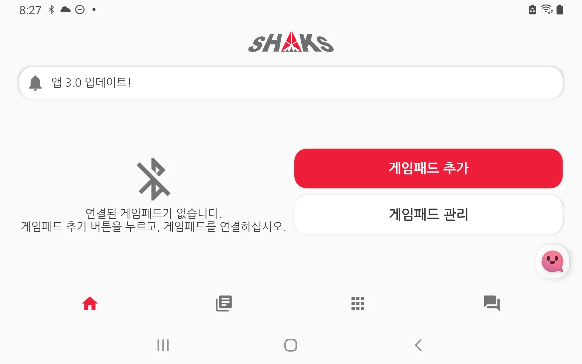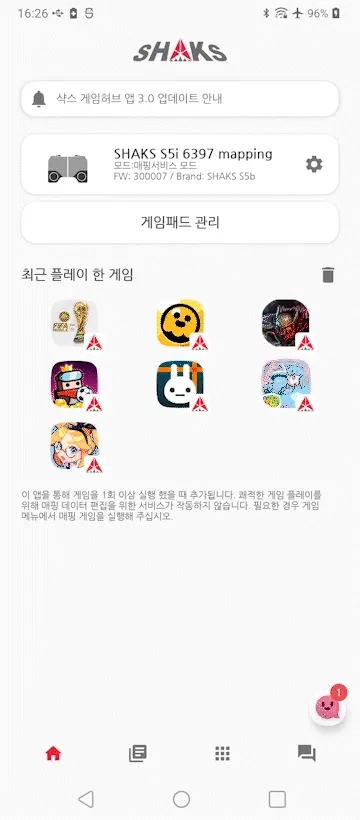 샥스는 지속적인 개발을 통하여 어플리케이션 기능을 추가하고 있습니다. 샥스 게임패드를 최신 FW로 어플을 최신으로 유지할 것을 권장합니다. 또한 모든 사진 자료는 개발 중에 촬영한 스크린샷으로써, 실제 버전과 일부 변경이 있을 수 있습니다.