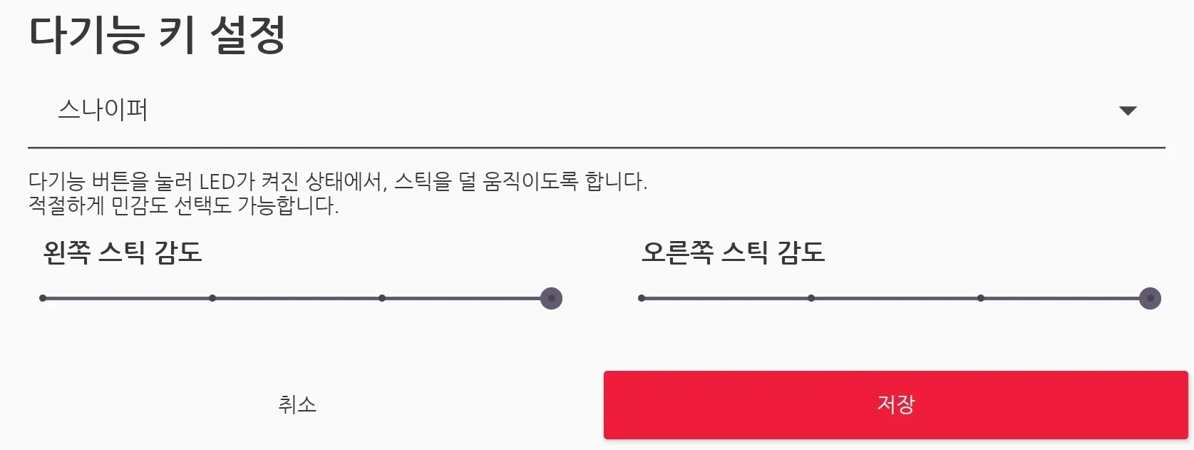 왼쪽/오른쪽 스틱을 보다 미세하게 제어할 때 사용하며, 민감도를 플레이 스타일에 맞추어 조정하시면 됩니다.