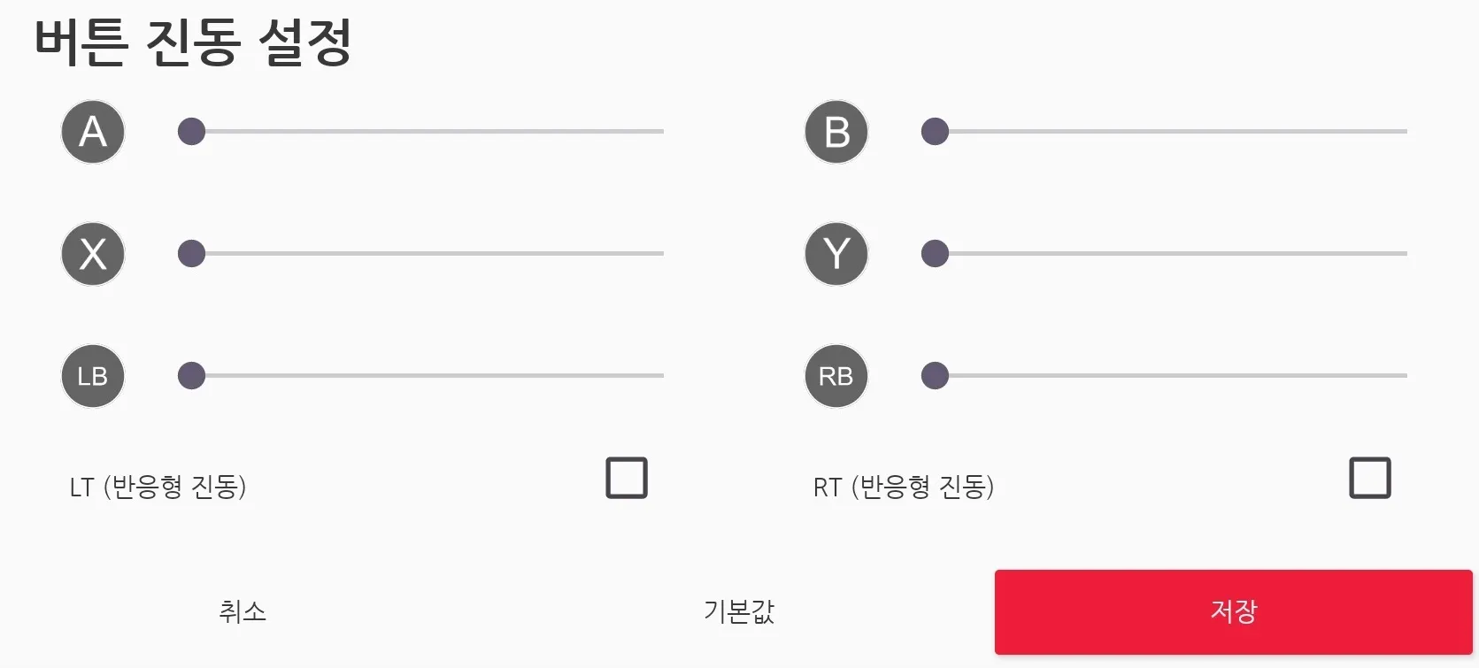 A, X, LB, LT는 진동이 작동하지 않고, B, Y, RB, RT는 진동이 작동합니다.