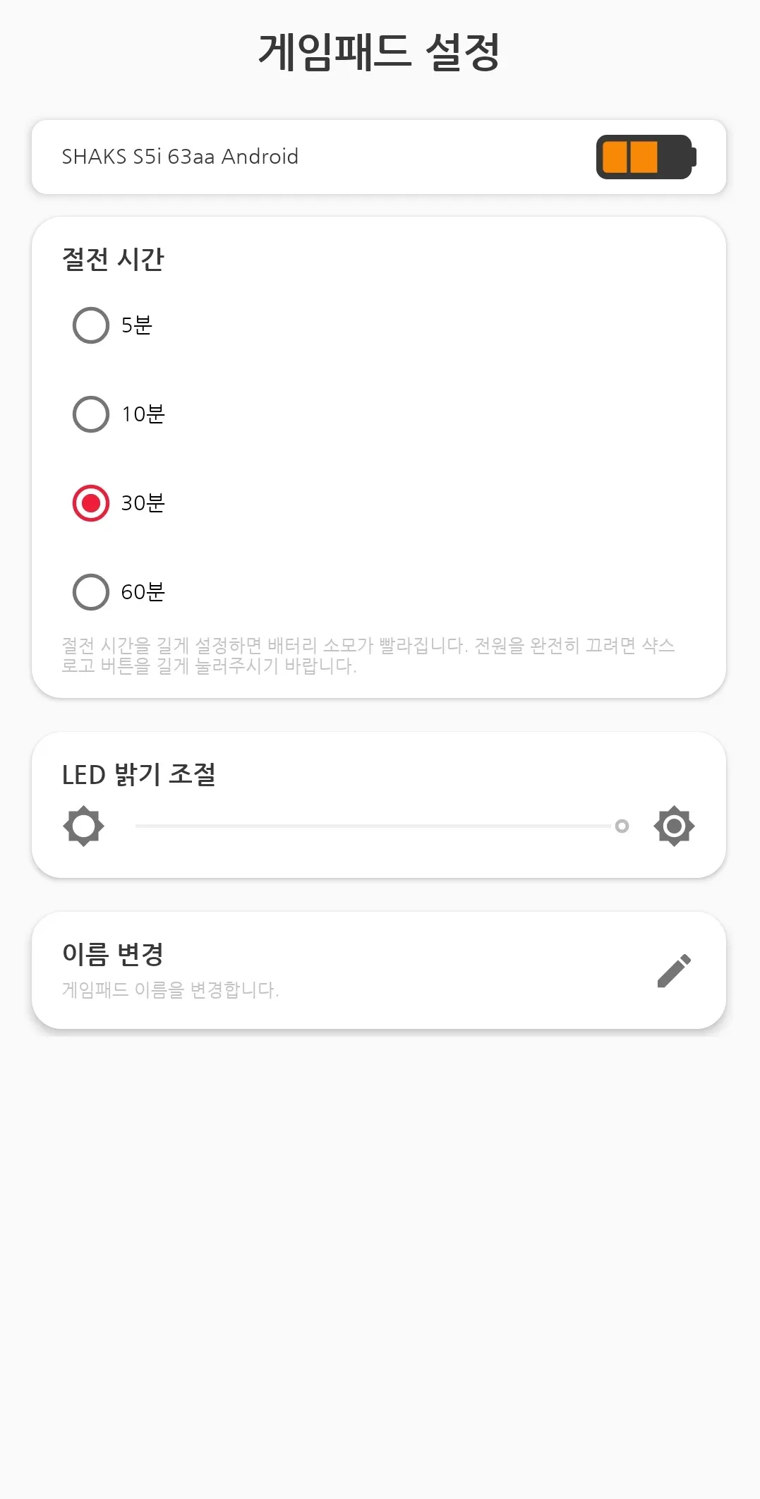 절전 시간, LED 밝기 조정 및 게임패드 이름 변경 등을 하실 수 있습니다.