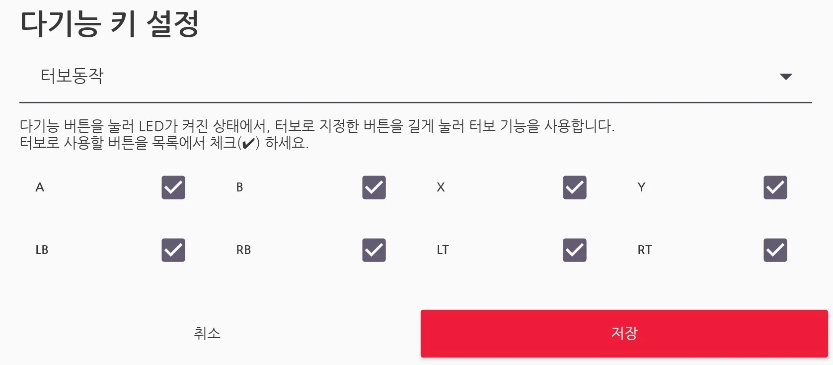 Function 버튼을 눌러 LED가 켜지면 적용되며, 지정한 버튼을 길게 누르면 터보 (연속) 동작이 작동합니다.