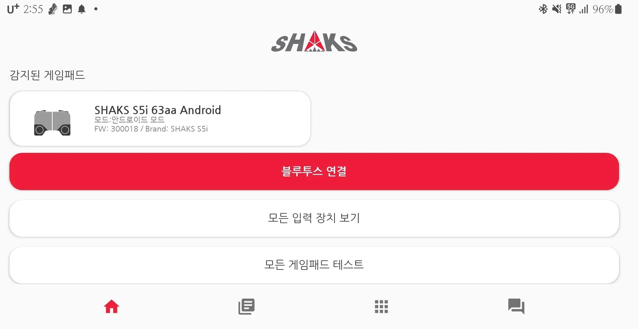 연결된 게임패드 목록 전체가 보입니다. 최대 4대까지 연결 권장 드립니다. 타사 컨트롤러도 표시되지만, 샥스 어플리케이션과 동작은 되지 않습니다.