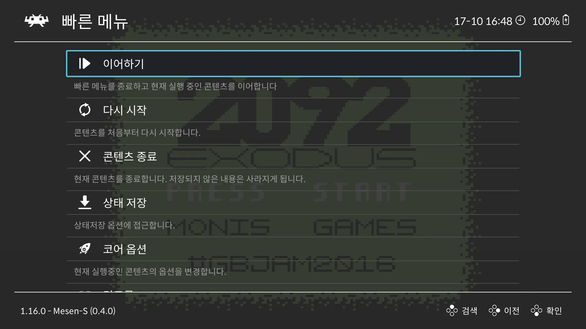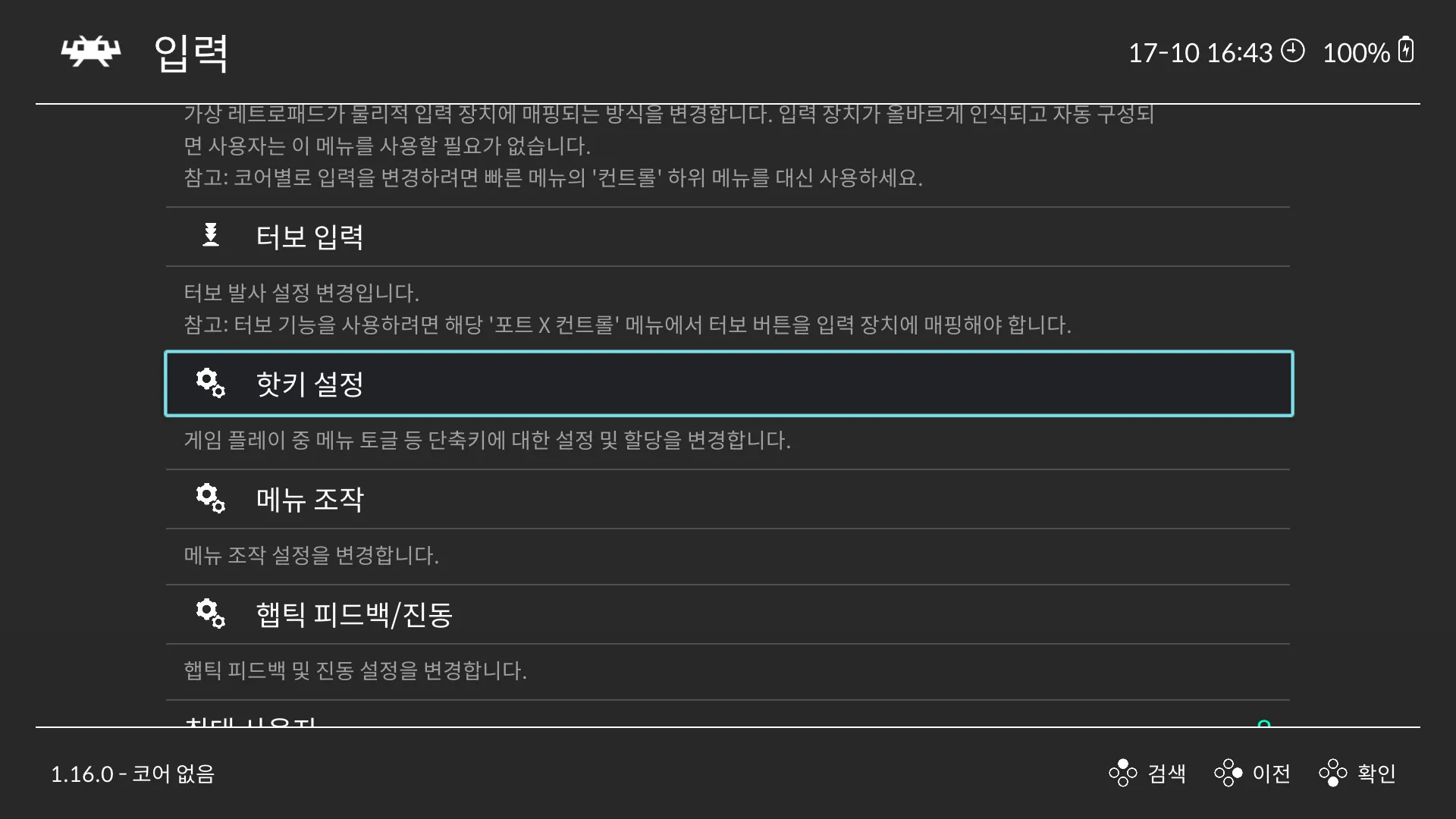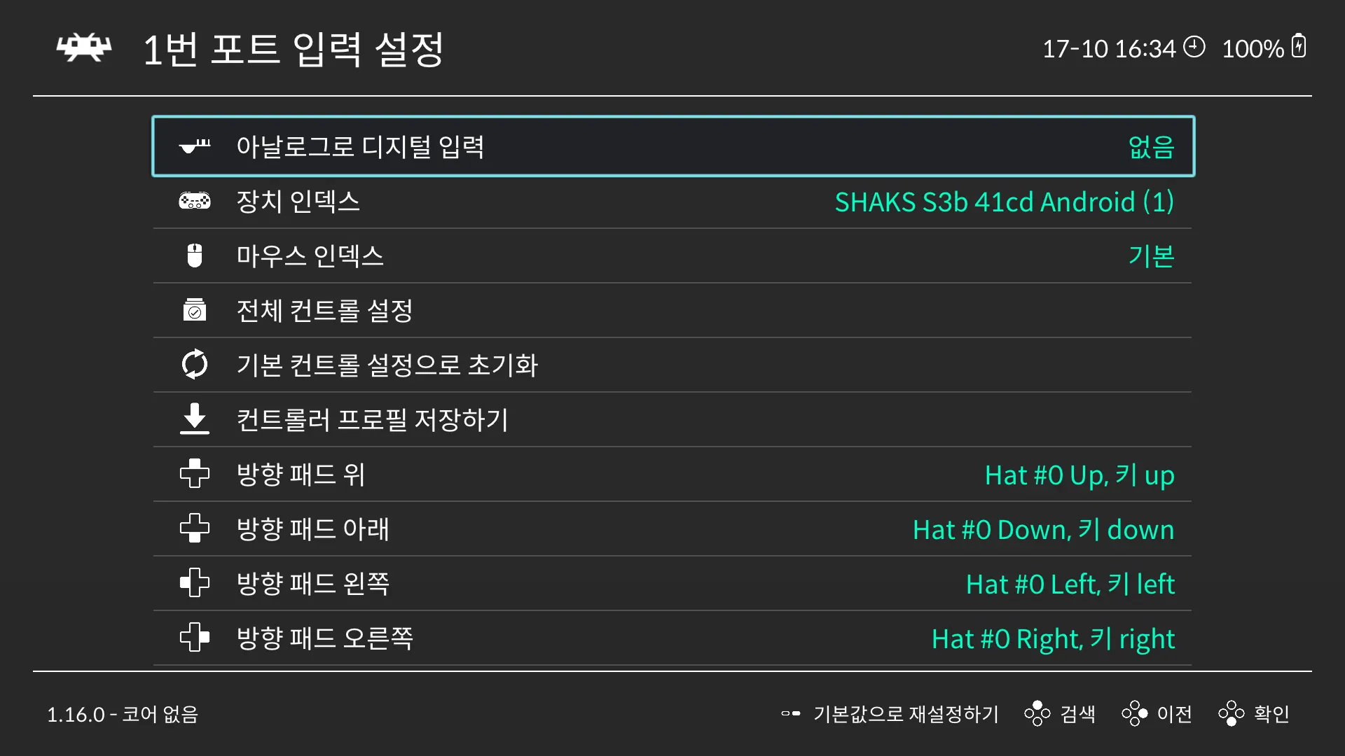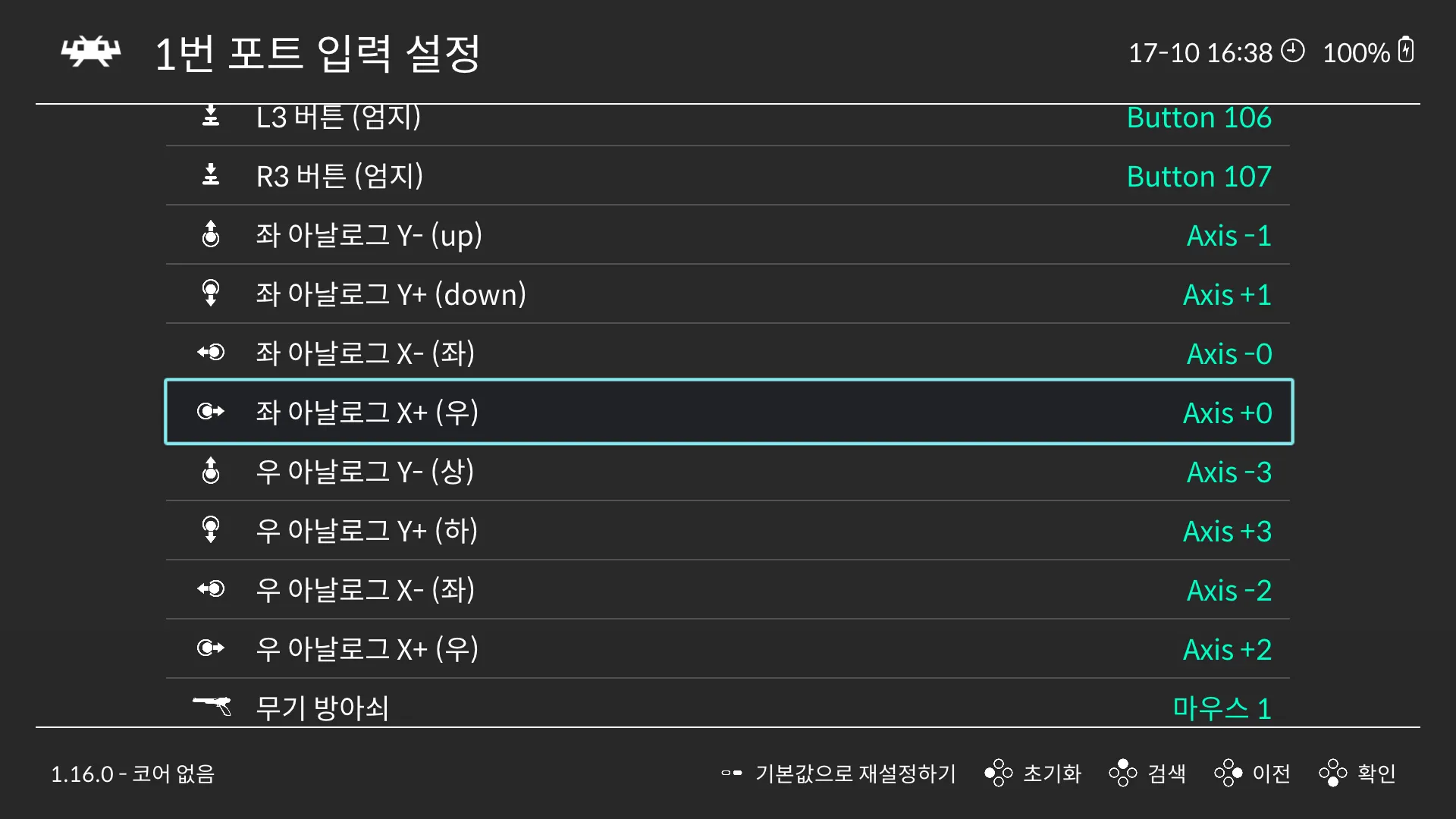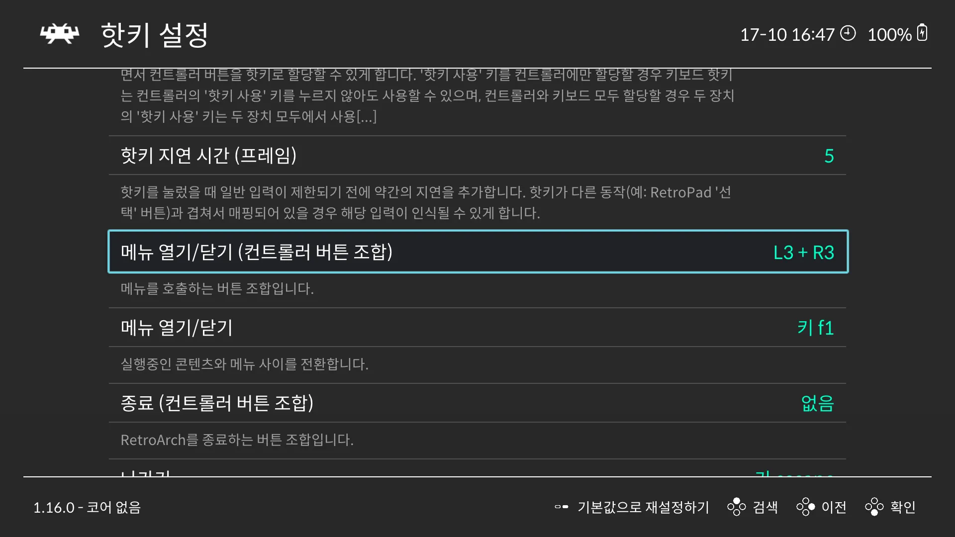 사진과 같이 준비하면 게임패드의 L3+R3 키 조합으로 RetroArch 시스템 메뉴를 열고 닫을 수 있습니다.